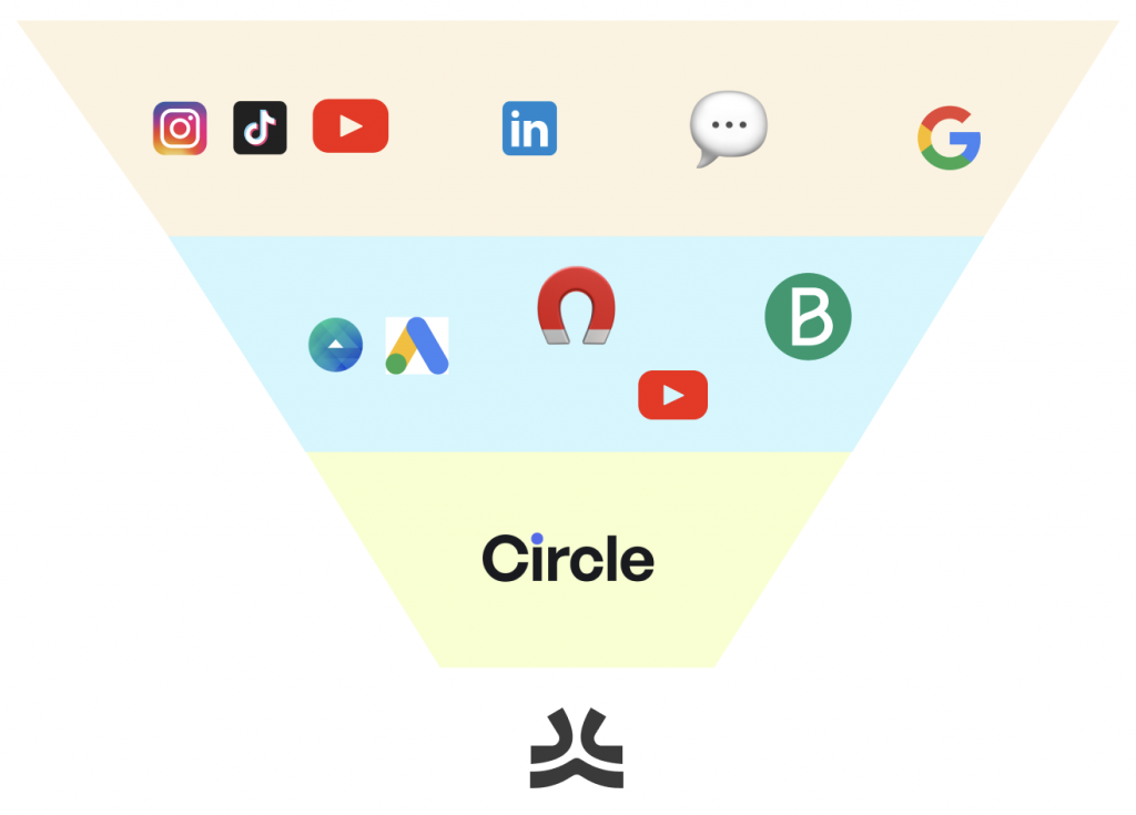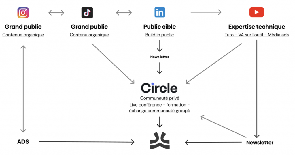 Notre écosystème se base sur plusieurs groupes de leviers pour développer la notoriété et l’acquisition de nouveaux membres dans la communauté pour qu’ils deviennent clients d’Airoi. Le but est de centraliser dans un premier temps les utilisateurs vers Circle, qui est une solution permettant de créer une communauté et de partager des cours vidéos pour les former à l’utilisation de notre SaaS. Le but est de les former petit-à-petit sur l’utilisation et les meilleures stratégies qu’ils peuvent adopter pour leurs campagnes publicitaires, et qu’une fois assez informés sur la solution, ils puissent devenir clients.