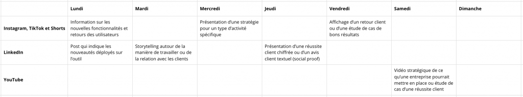 Pour la planification de nos contenus, le but est de pouvoir prévoir une semaine type au niveau des thématiques de publication, pour que notre audience puisse se retrouver et rester connectée aux différents canaux.