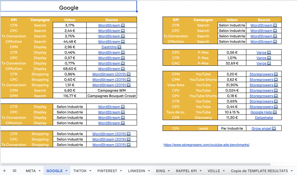 Pour finir, j’ai Ă©tĂ© amenĂ© Ă crĂ©er une compilation de KPI pour les diffĂ©rentes rĂ©gies et objectifs de campagnes, en les tirant de diffĂ©rentes sources dans le but de pouvoir donner des estimations lors de propositions commerciales Ă des clients, et de pouvoir Ă©valuer la performance de nos campagnes.
